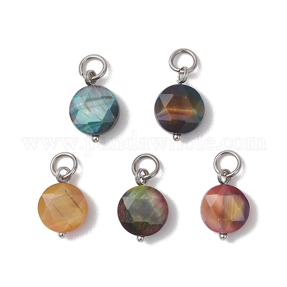 Подвески из натурального окрашенного тигрового глаза с шестиугольной огранкой, плоские круглые подвески с 304 кольцами из нержавеющей стали, разноцветные