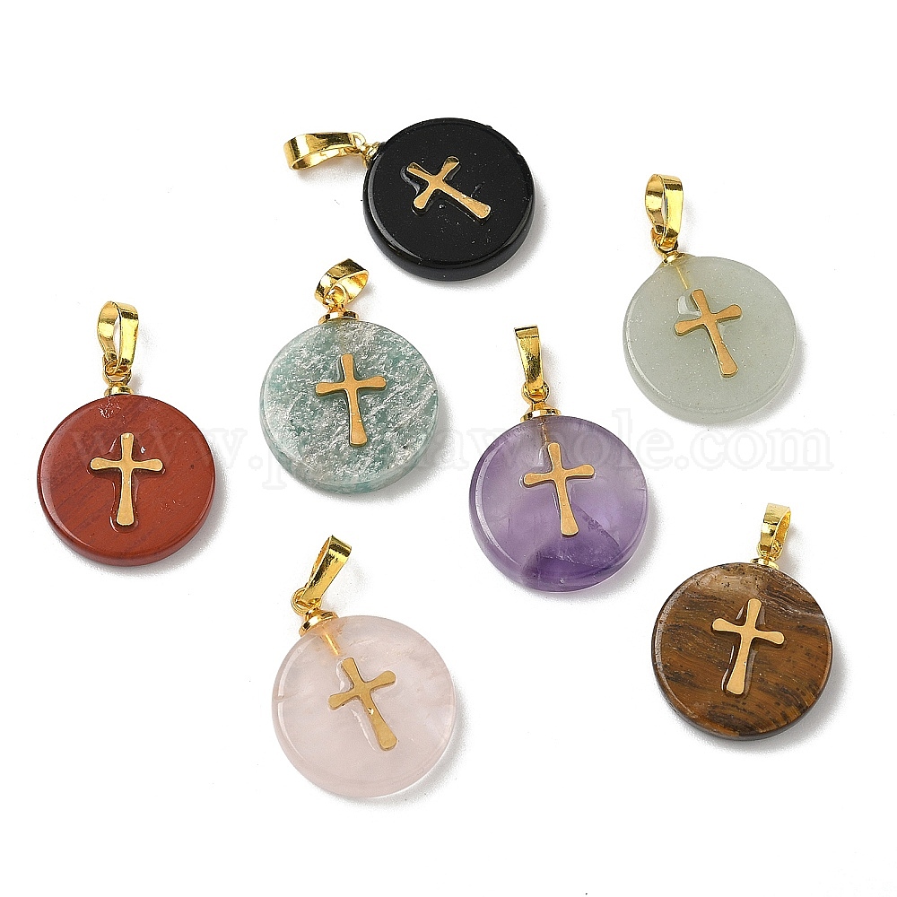 Природные смешанные подвески драгоценных камней, плоские круглые подвески золотистого оттенка 304 крестообразные пластины из нержавеющей стали и латунные застежки-кнопки