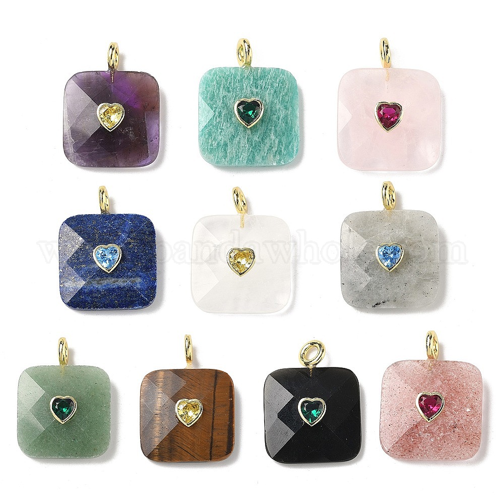 Ограненные подвески из натуральных драгоценных камней, Квадратные подвески с латунными фианитами в оправе из кубического циркония, золотые