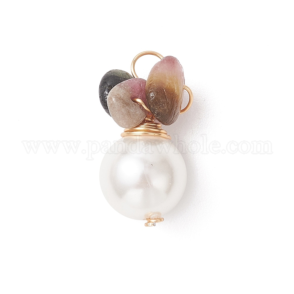 • Турмалин Подвески из натурального турмалина с жемчужинами из раковин, обмотанными медной проволокой., круглые подвески, золотые, 26.5~28.5x12.5~14.5x13.5~15.5 мм, отверстие : 4.5 мм
