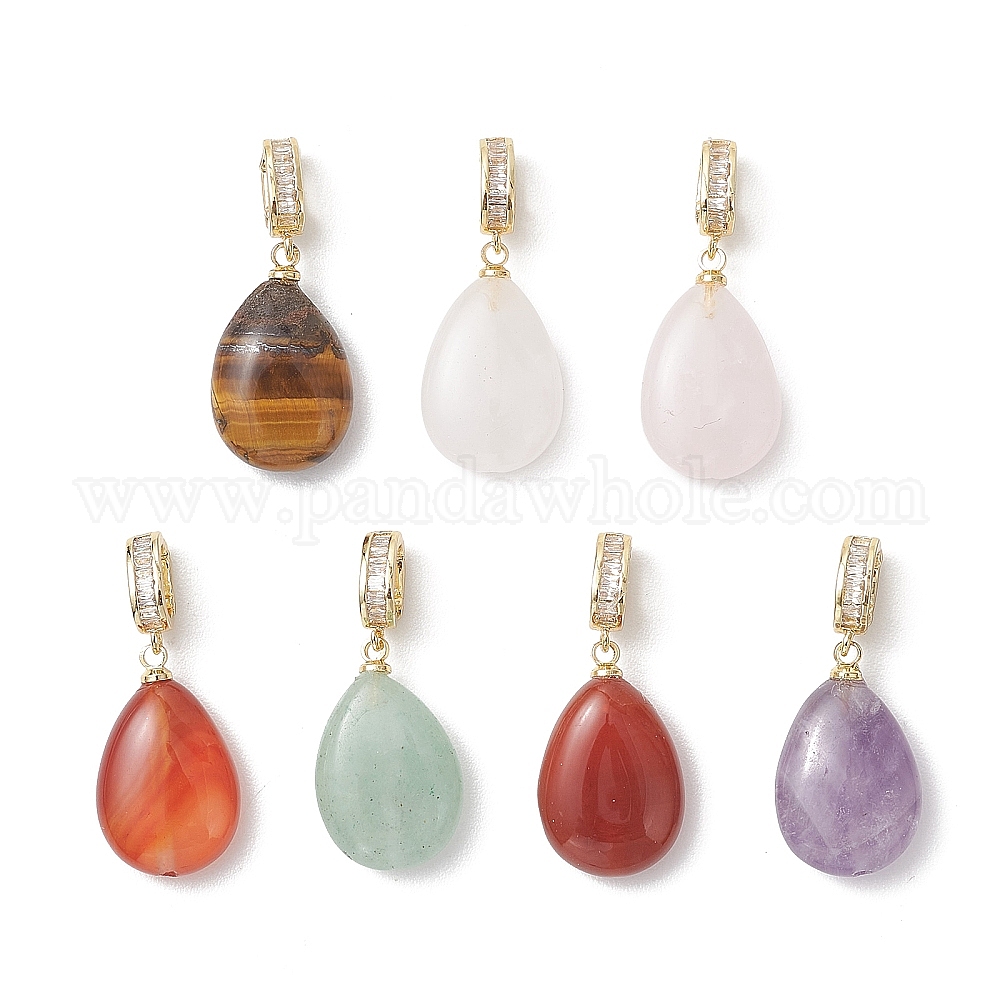Подвески из натурального аметиста, розового кварца, красного агата, зеленого авантюрина и тигрового глаза., Подвески в форме капли с латунными микропаве из прозрачных кубических цирконий в качестве застежек.
