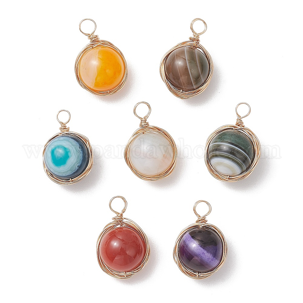 Подвески из натурального полосатого агата, обмотанного медной проволокой (окрашенного и подвергнутого термической обработке)., круглые подвески, золотые