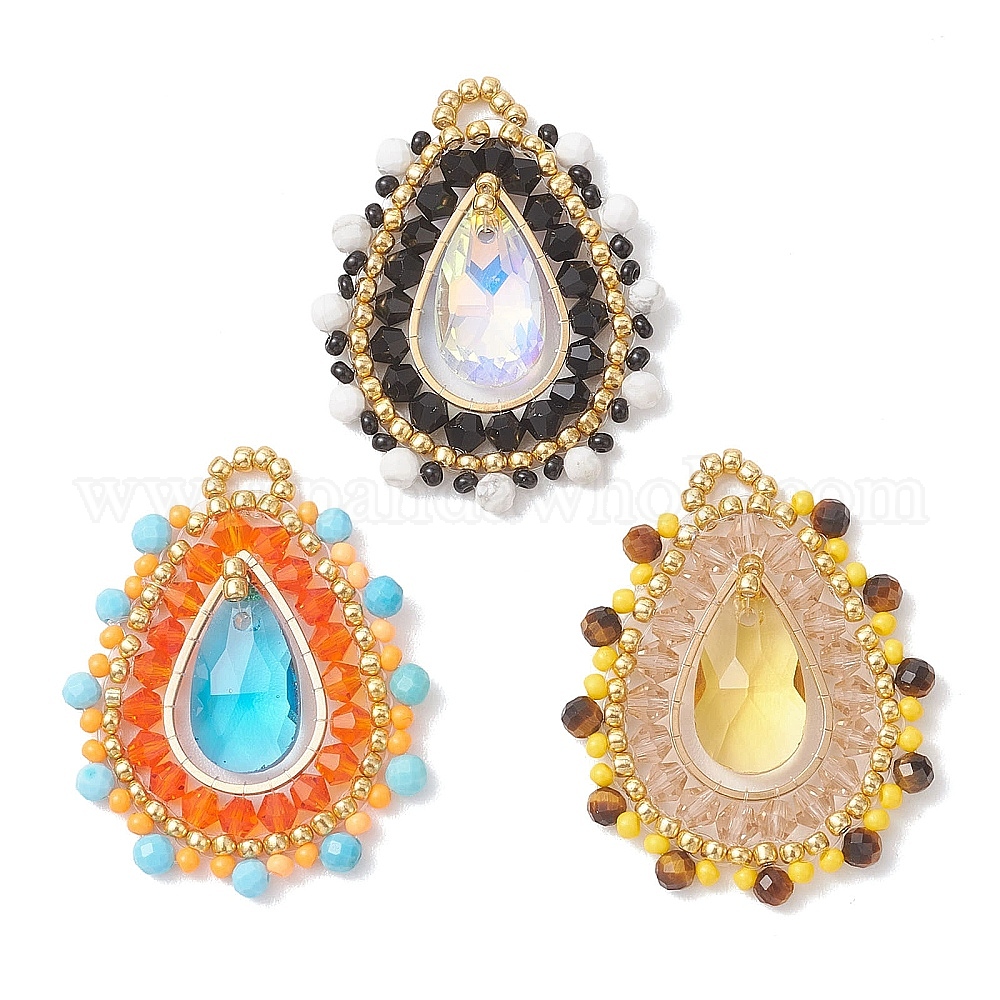 3 шт. 3 цвета натуральный говлит, окрашенный магнезит и тигровый глаз, ограненные круглые подвески и стеклянные бусины, слезинки, золотые (03A6X1)