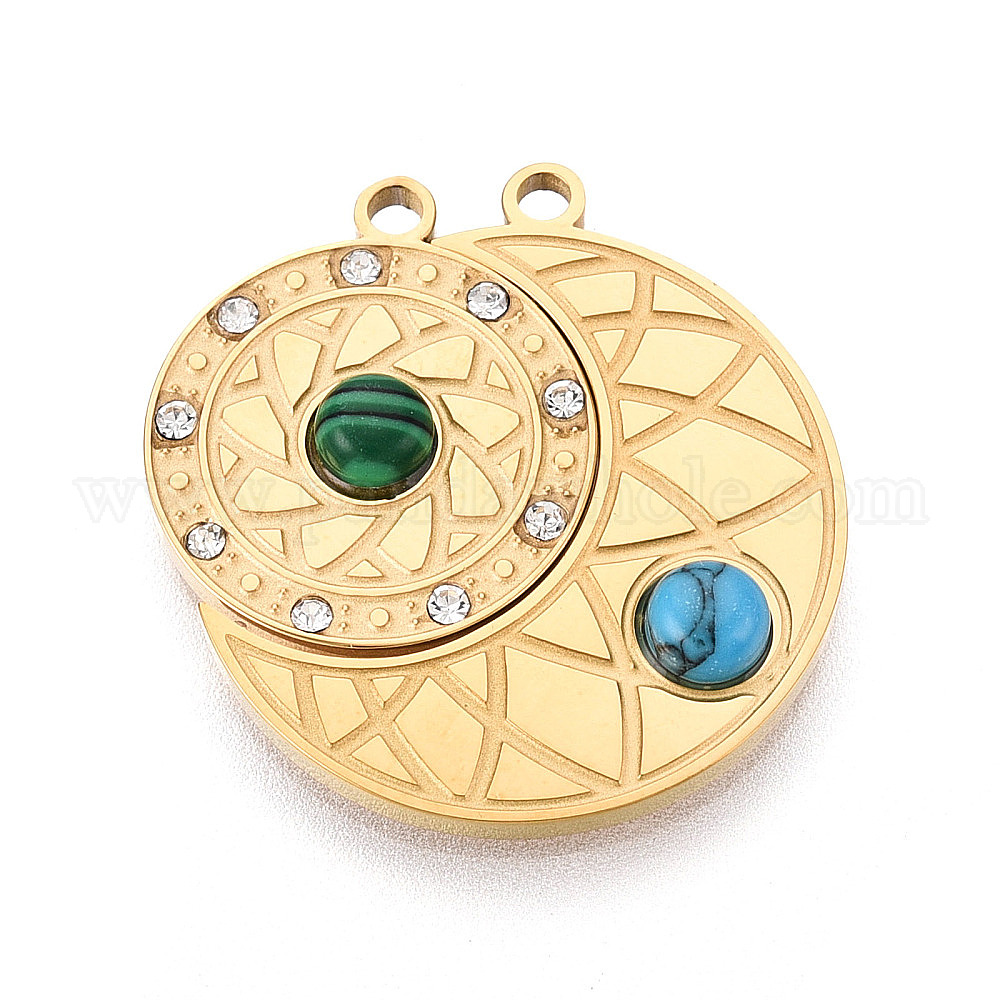 304 Подвески из нержавеющей стали со стразами и синтетической бирюзой, плоские круглые и полумесяцевидные подвески, ионное покрытие (ip)