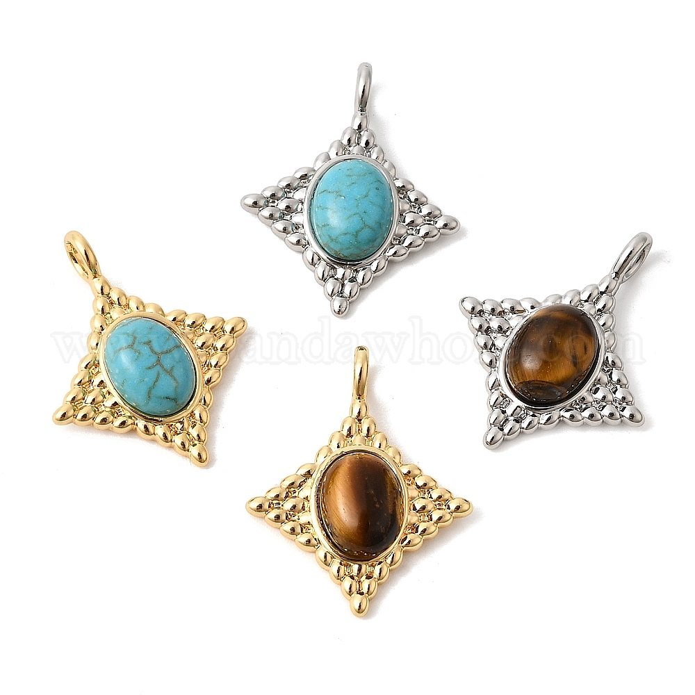 Подвески из натурального тигрового глаза и синтетической бирюзы, Подвески в форме ромба с латунными оправами