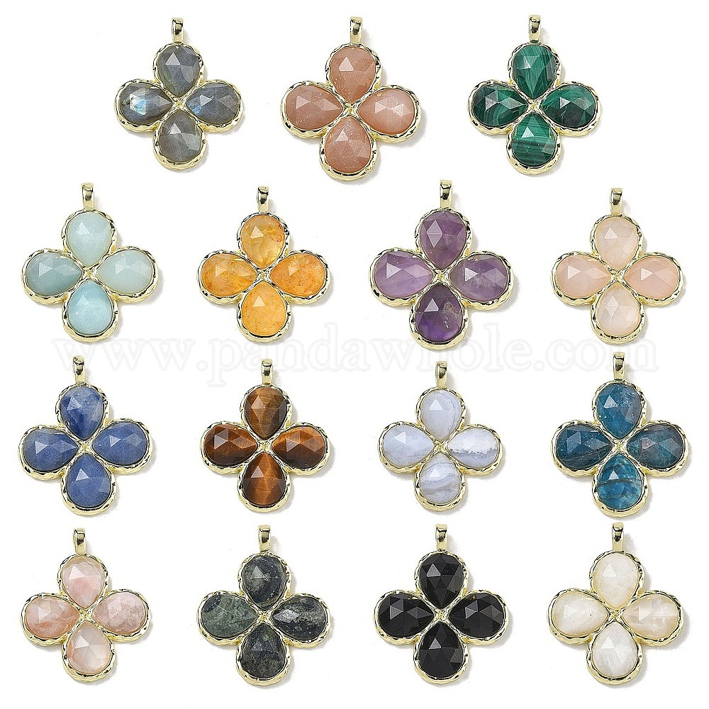 • Смешанные камни Граненые подвески из натуральных смешанных камней, Подвески в виде клевера с латунными застежками с гальваническим покрытием., золотые, смешанные окрашенные и неокрашенные, 30~31x25.5x5.5~6 мм, отверстие : 4x3 мм