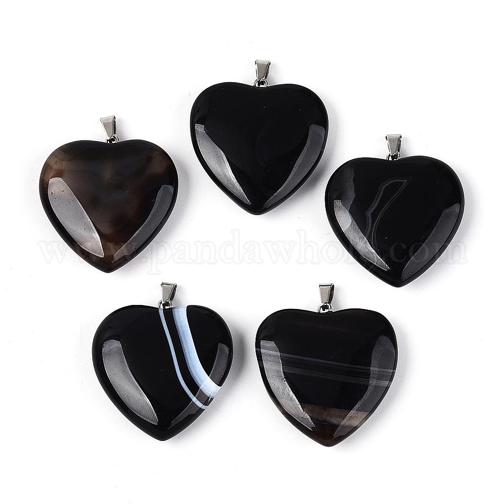 Подвески из натурального черного полосатого агата (окрашенного и подвергнутого термической обработке)., Подвески в форме сердца с железными защелками., платина