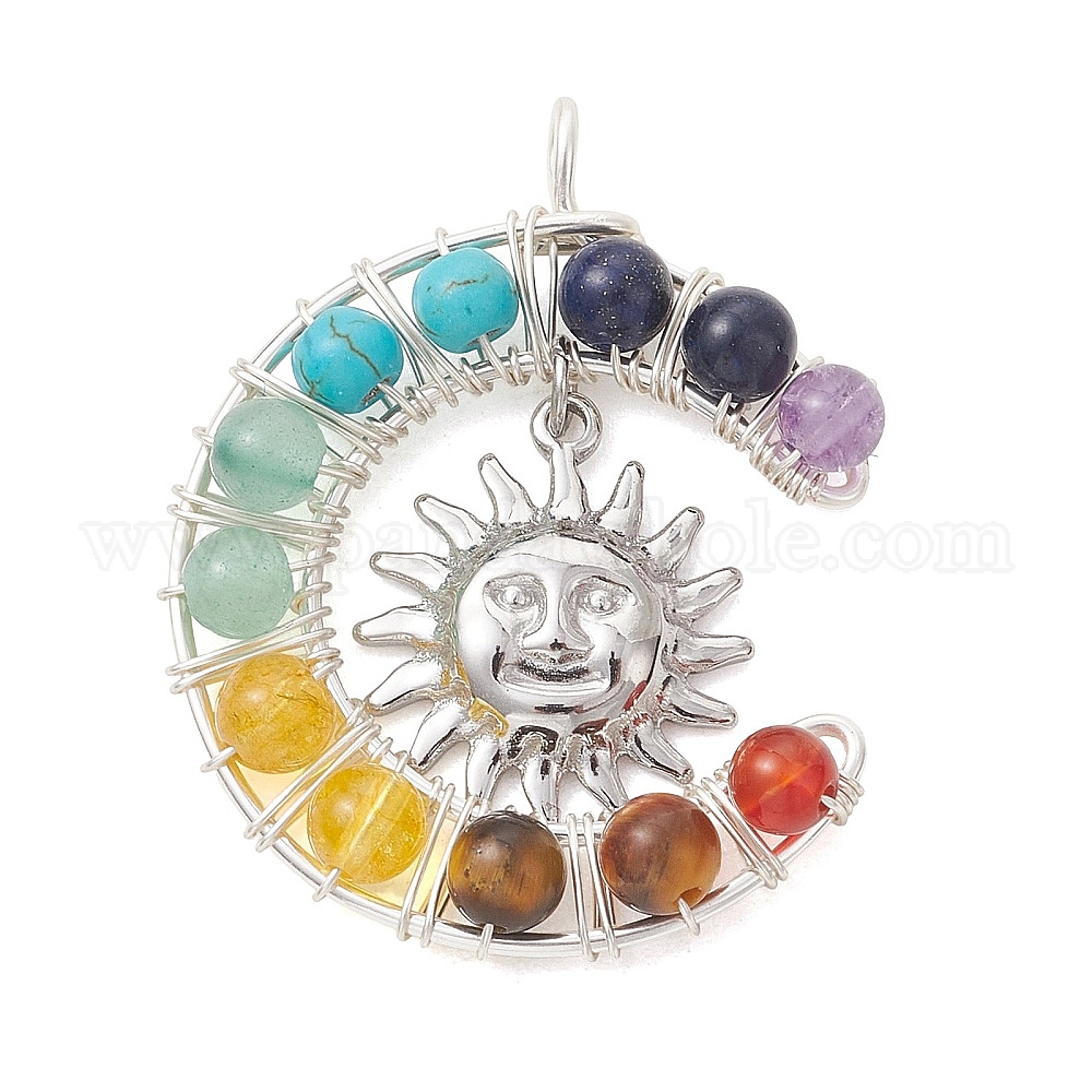 7 Круглые подвески в виде луны из смешанных камней, обмотанных медной проволокой, с изображением чакр, латунные солнечные подвески, смешанные окрашенные и неокрашенные