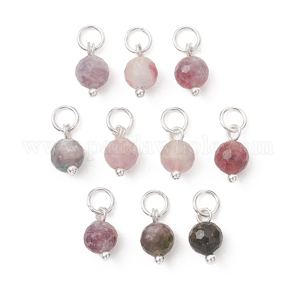 • Серебро Кулоны с турмалином из натуральных цветов сливы, граненые круглые подвески, с 304 кольцами из нержавеющей стали, серебряные, 10x6 мм, отверстие : 3.5 мм
