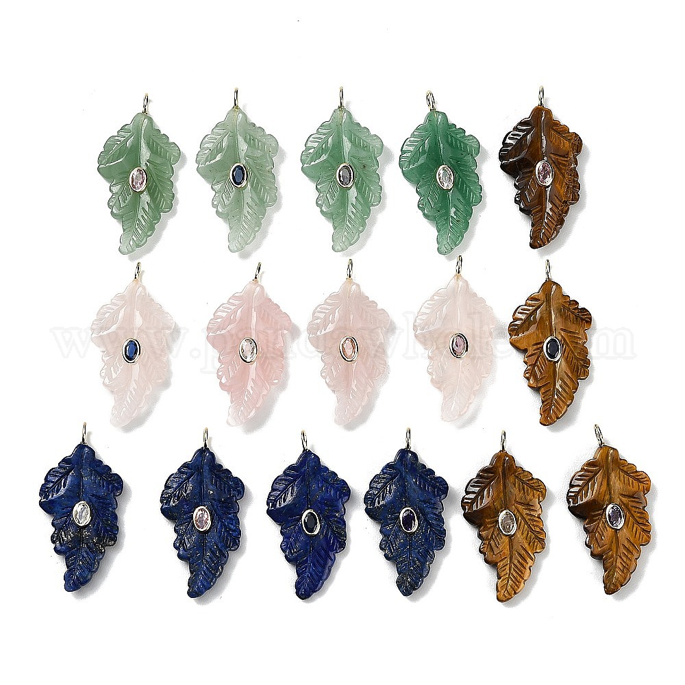 Резные подвески из натуральных драгоценных камней, Подвески в виде листьев с фурнитурой из микропаве из латуни золотистого оттенка и кубическими циркониями случайного цвета. (03BG2X)