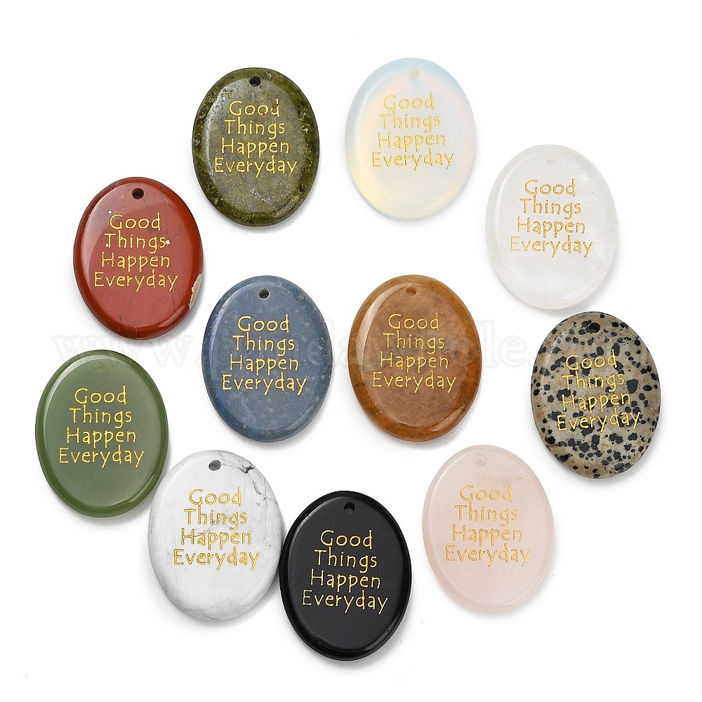 • Смешанные камни Природные и синтетические смешанные каменные подвески, плоские овальные подвески с золотой надписью «Хорошие вещи случаются каждый день», смешанные окрашенные и неокрашенные, 44.5~45x35x7 мм, отверстие : 2.5 мм