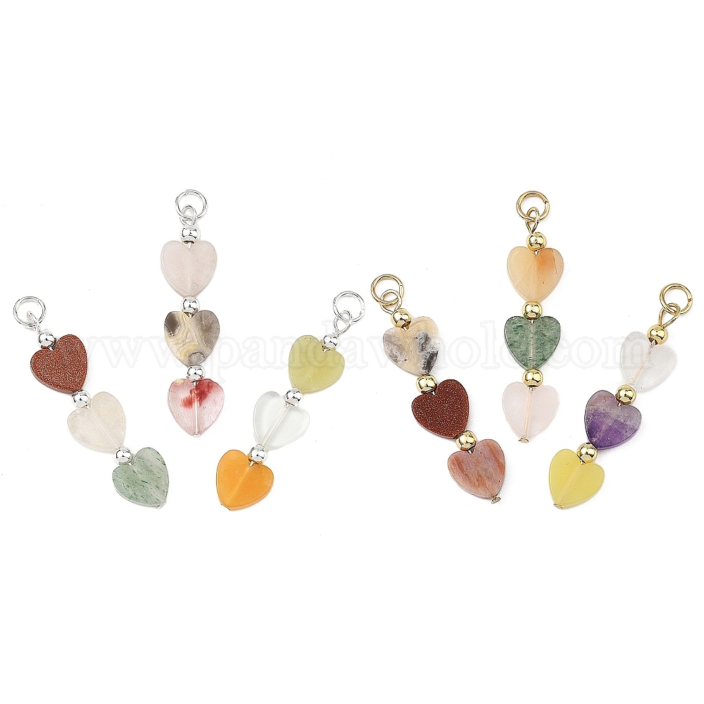 Природные и синтетические смешанные подвески драгоценных камней, Подвески в форме сердца из бисера с латунными соединительными кольцами, смешанные окрашенные и неокрашенные