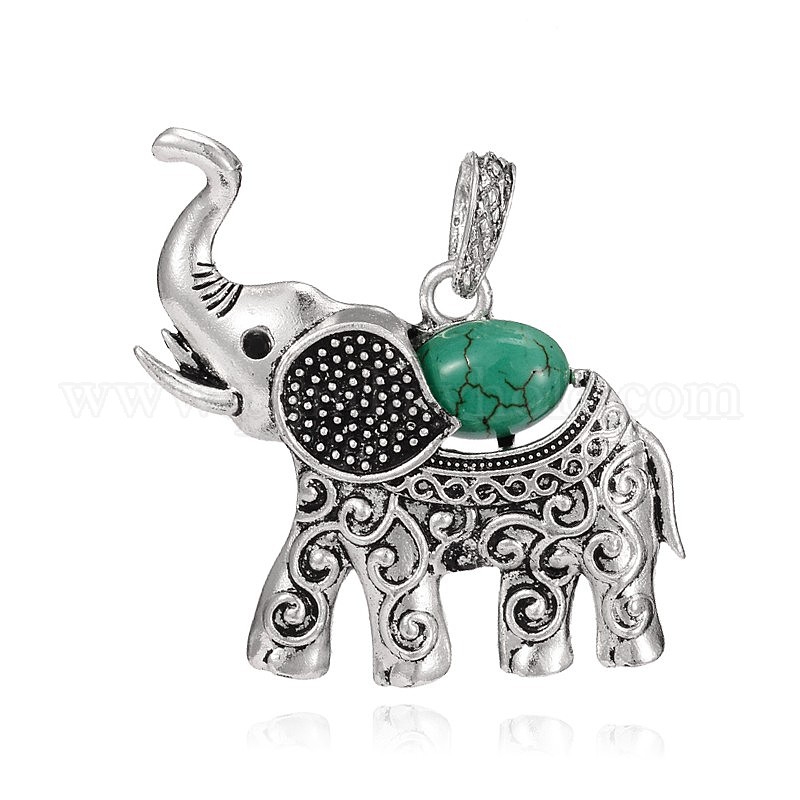 Античный посеребренные литые окрашенных подвески слонов синтетический бирюзовые, со стразами, 48x44x7.5 мм, отверстие : 9x5 мм