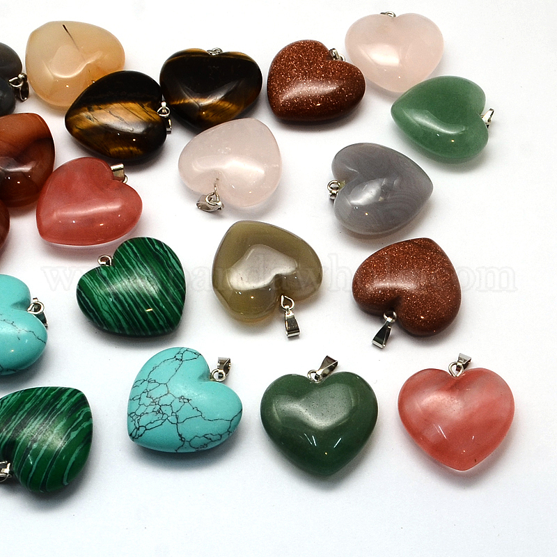 Сердце драгоценный камень подвески, с латунной фурнитурой платинового цвета, 24~26x25~26x9~10 мм, отверстие : 2x7 мм