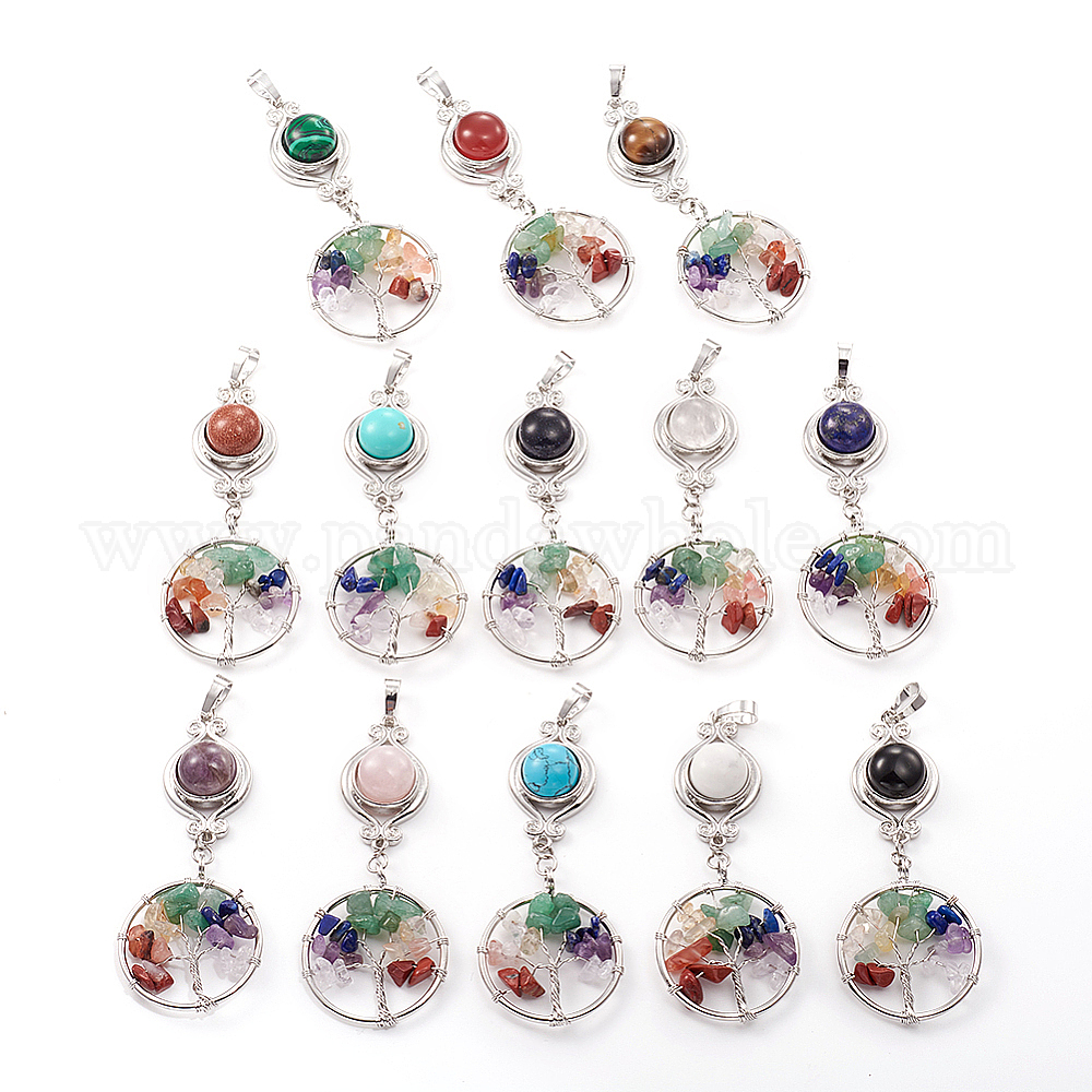 Драгоценный камень большие кулоны, с латунной фурнитурой и натуральным смешанным камнем "Древо жизни", плоско-круглые, платина