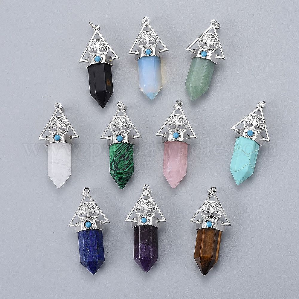 • Смешанные камни Большие подвески из смешанных натуральных и синтетических драгоценных камней, с латунной фурнитурой платинового цвета, граненые, пуля, треугольник и древо жизни, 61x28.5x20 мм, отверстие : 8x5 мм