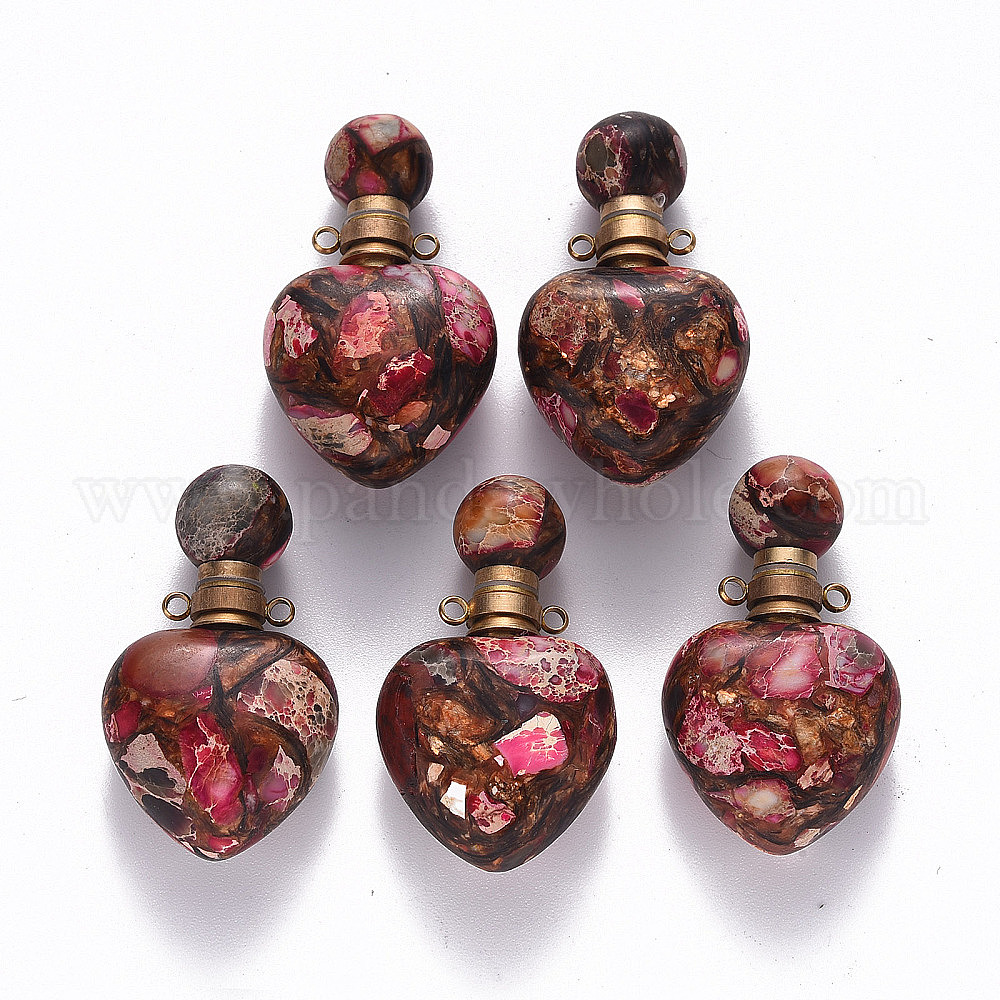 Кулоны для духов из натурального бронзита и синтетической императорской яшмы в сборе в форме сердца, с латунной фурнитурой , окрашенные