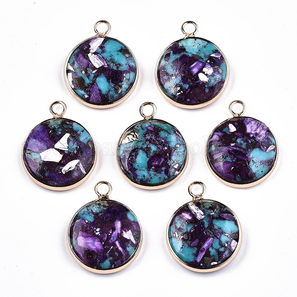 • Сине-фиолетовый Плоские круглые собранные подвески из синтетической бирюзы и натурального регалита / императорской яшмы, с железной петлей и латунным краем, золотой свет, окрашенные, синий фиолетовый, 22x18x5~6 мм, отверстие : 2 мм