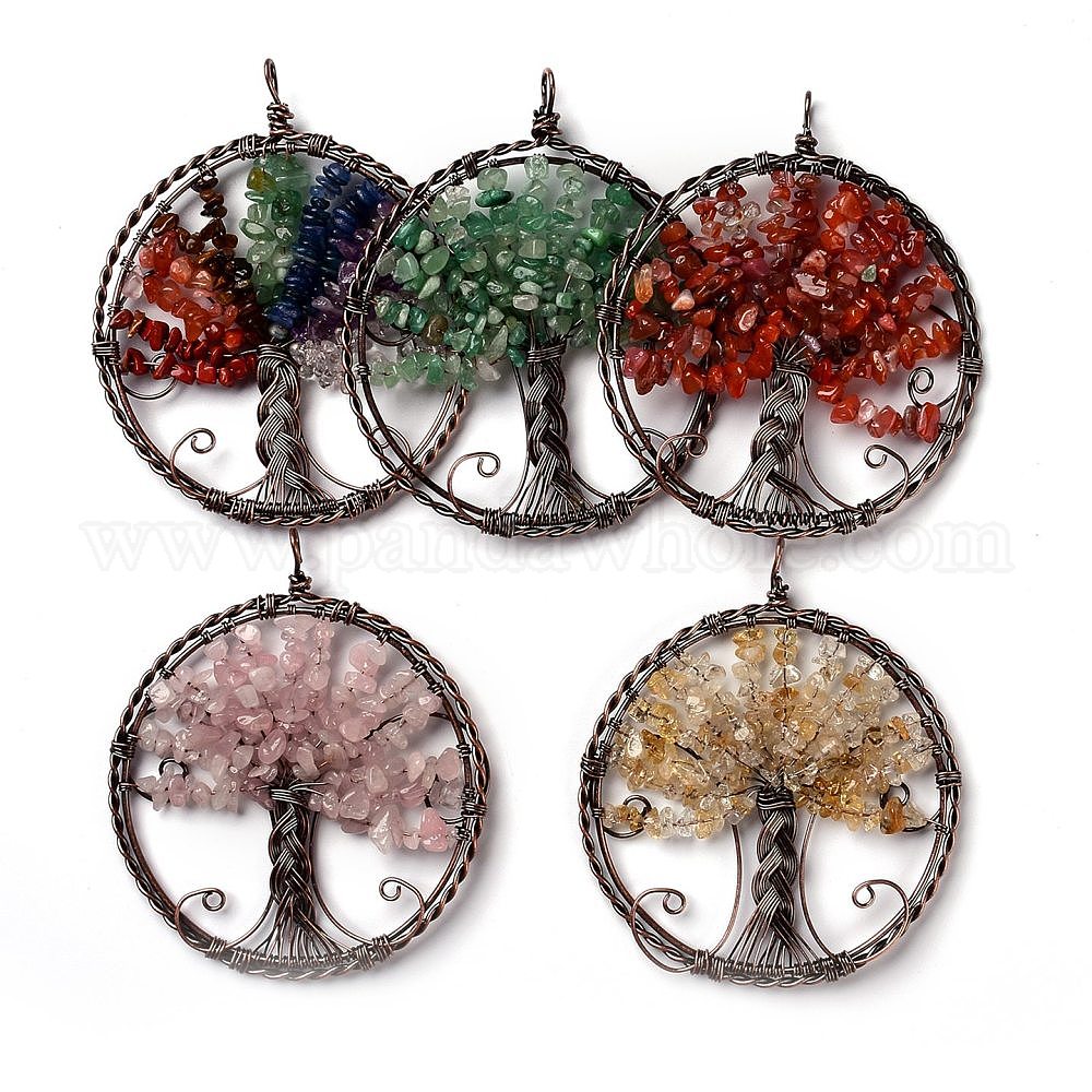 Бусины из смешанных драгоценных камней большие подвески, с латунной фурнитурой , плоские круглые с дерева жизни