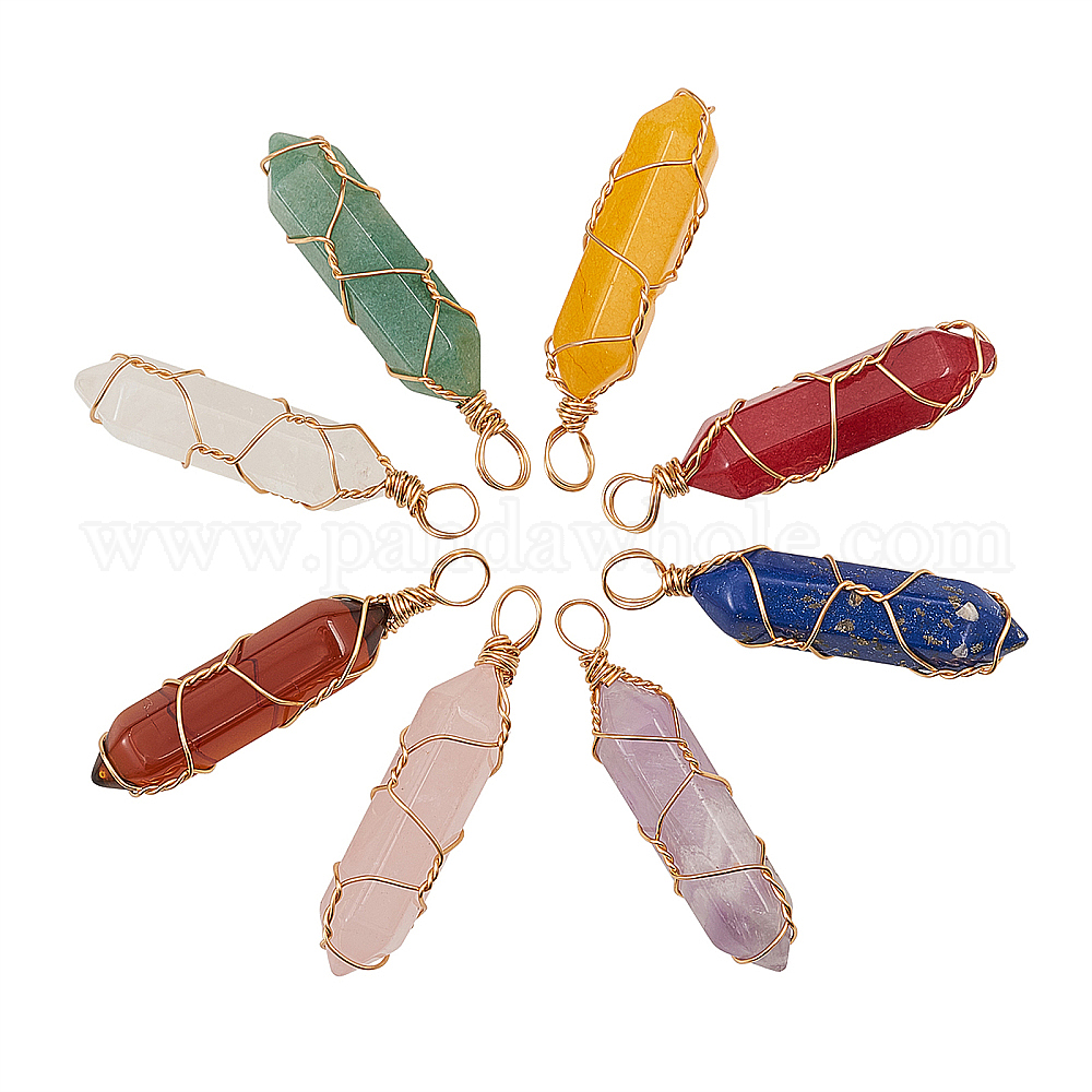 8 шт 8 стиль подвески из натуральных драгоценных камней, с золотой стальной проволокой, шестиугольник призма