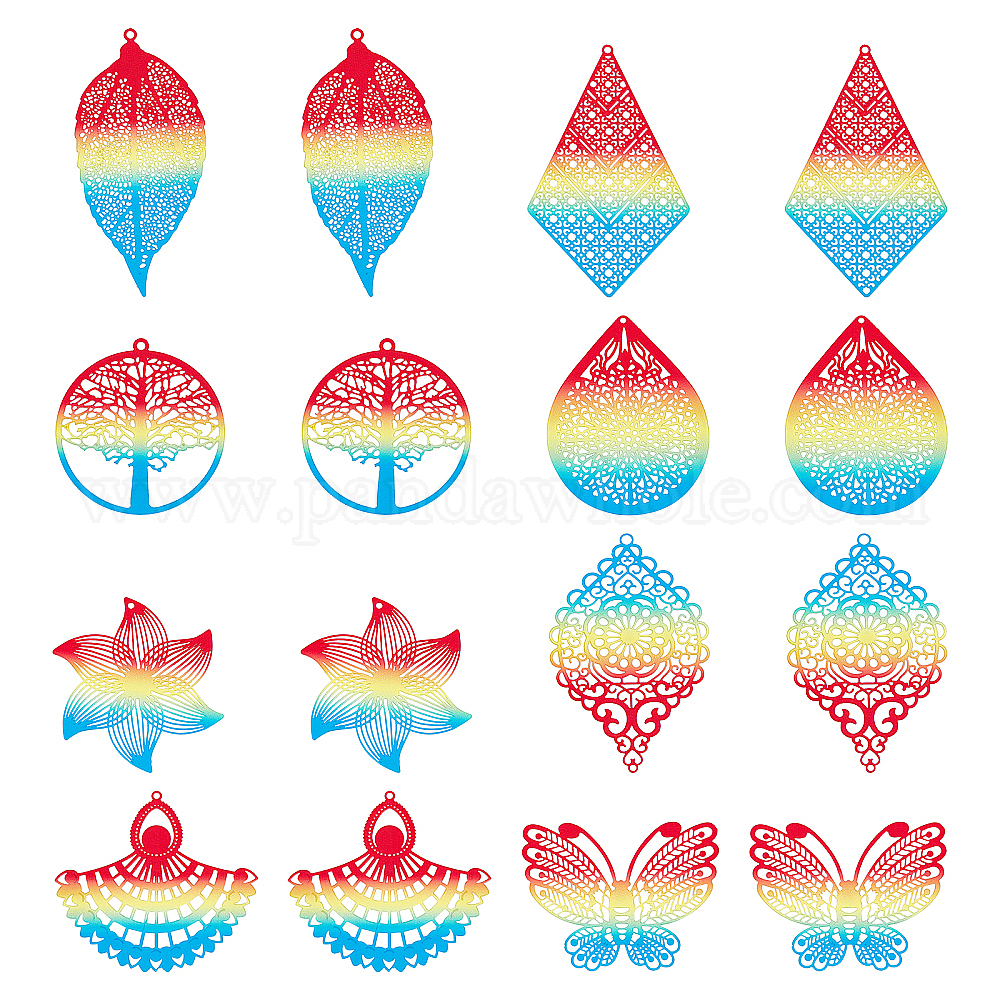 • Разноцветный 16 шт 8 стиль 430 подвески из нержавеющей стали, Ссылки на компоненты, окрашеные, гравированные металлические украшения, разнообразные, красочный, 37.5~61.5x30.5~50x0.5~0.7 мм, отверстие : 1.2~2 мм, 2 шт / стиль