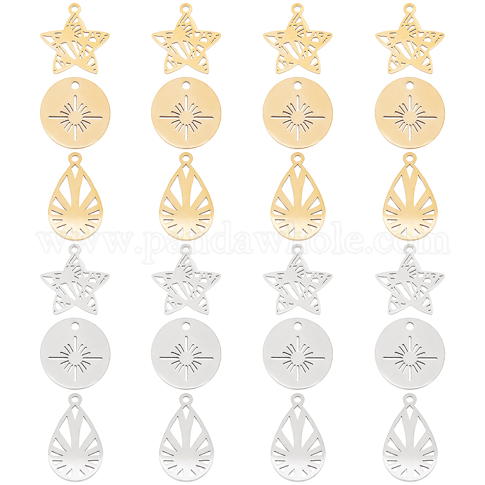 • Золотой & Цвет Нержавеющей Стали 24 шт 3 стиль 201 подвески из нержавеющей стали, лазерная резка, каплевидная и звездообразная и плоская круглая, золотые и нержавеющая сталь цвет, 15.5~19x11.5~15.5x1 мм, отверстие : 1.4~1.6 мм, 8 шт / стиль