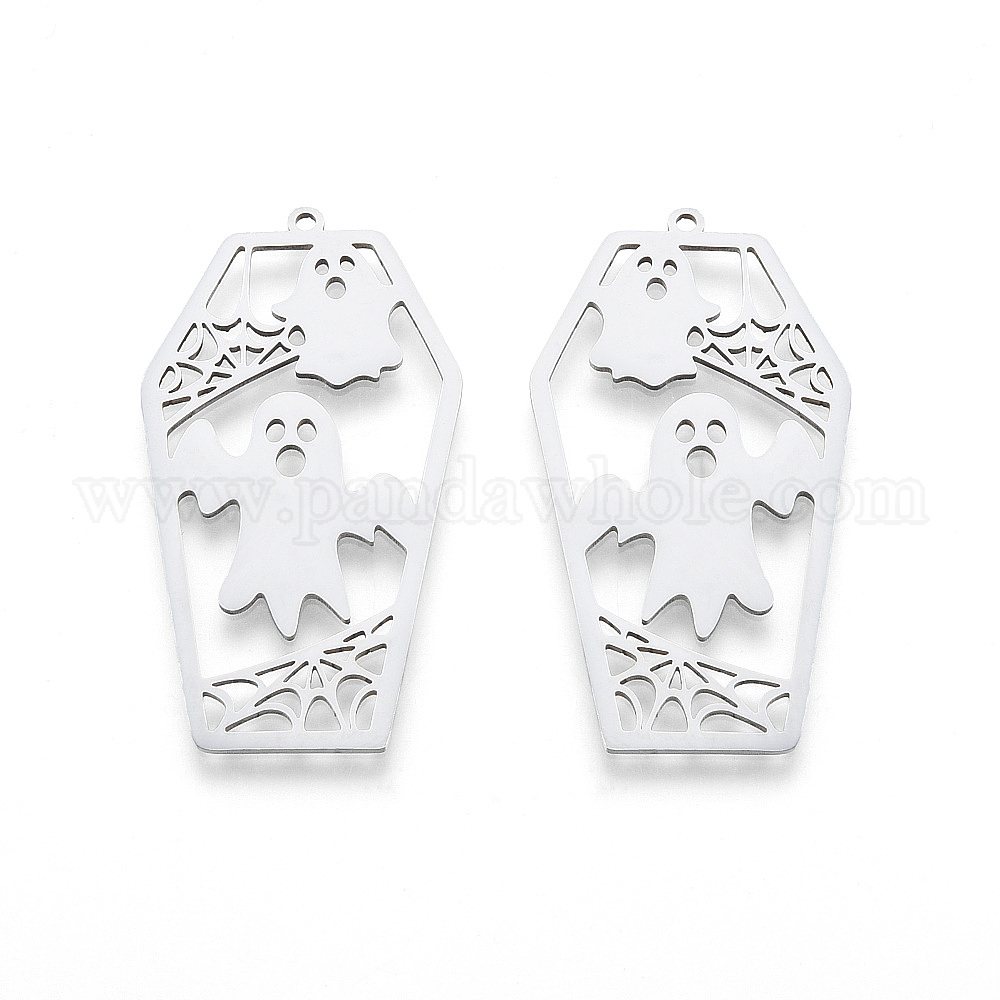 • Нержавеющая Сталь Цвет Не тускнеющие подвески на Хэллоуин 201 из нержавеющей стали, лазерная резка, гроб с призраком, цвет нержавеющей стали, 45x24x1 мм, отверстие : 1.5 мм