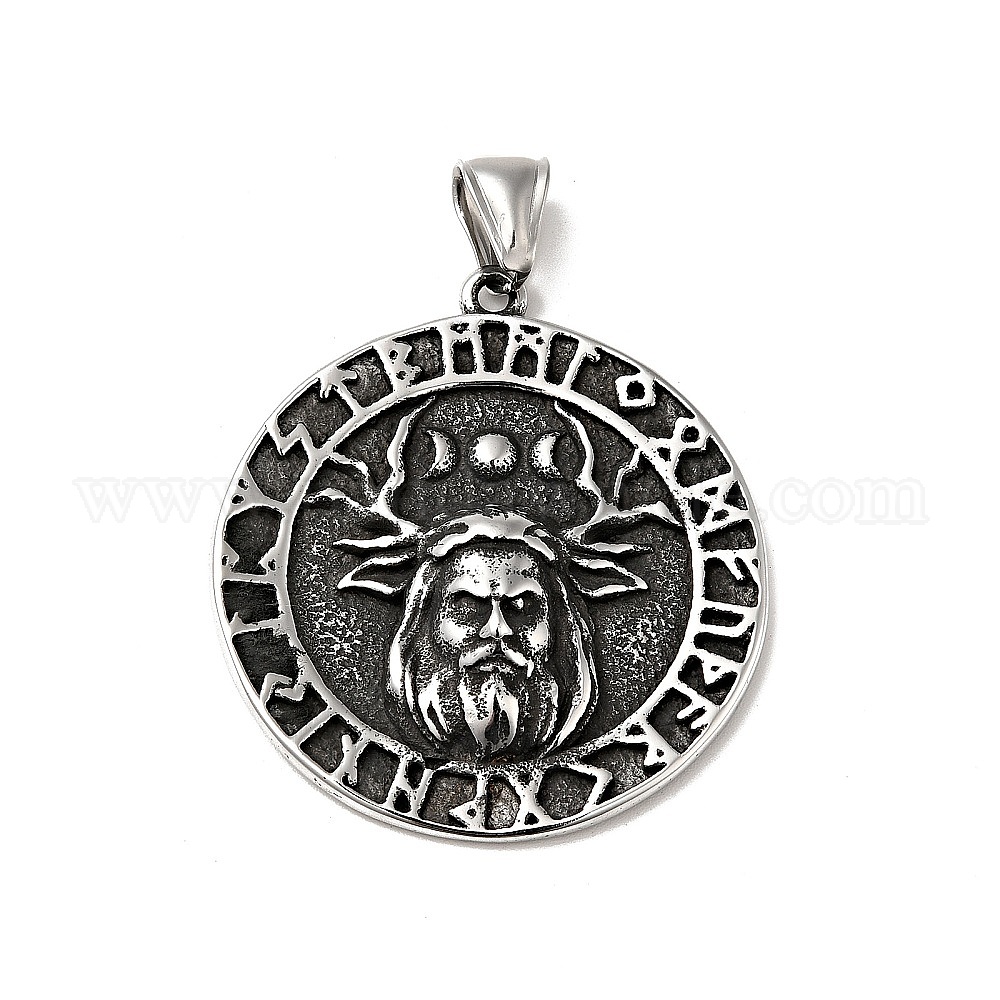 • Античное Серебро 304 подвески для ручной полировки из нержавеющей стали, плоские круглые с руническими шармами, античное серебро, 42x38x6 мм, отверстие : 4x8 мм