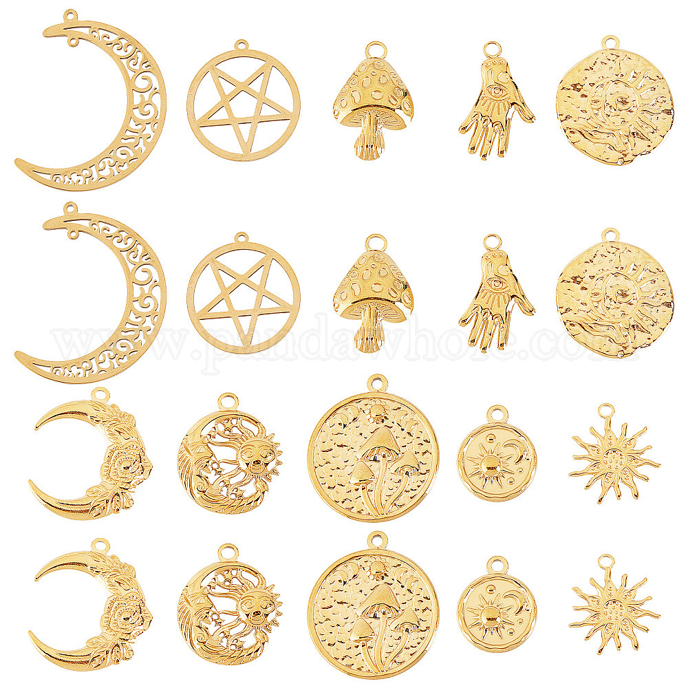 • Нержавеющая Сталь Цвет 20 шт 10 стиль 304 подвески из нержавеющей стали, плоская круглая с солнцем, луной и грибами, цвет нержавеющей стали, 18~40x15~34x1.5~4 мм, отверстие : 1.4~2 мм, 2 шт / стиль