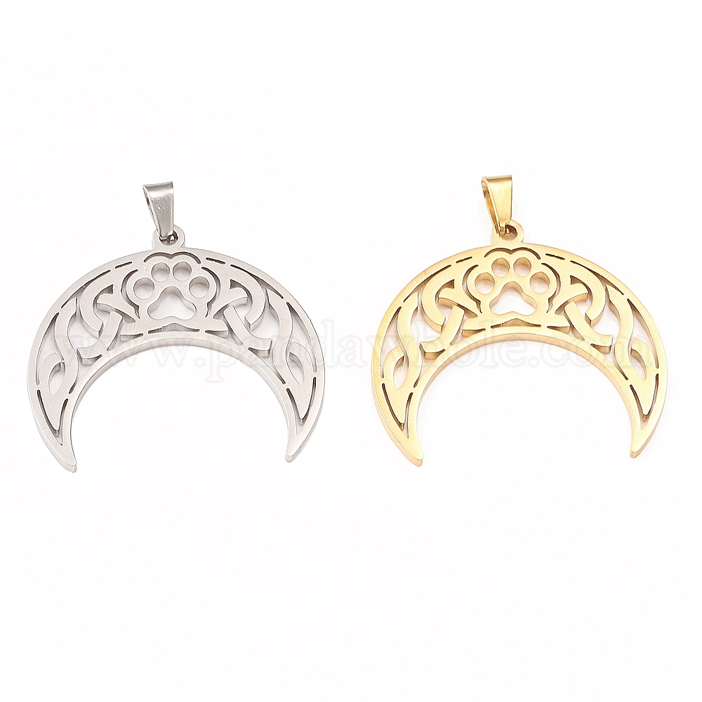 • Золотой 304 из нержавеющей стали полые подвески, двойной рог/полумесяц с подвеской в виде кошачьей лапы, золотые, 28x30x1.5 мм, отверстие : 4.5x3 мм