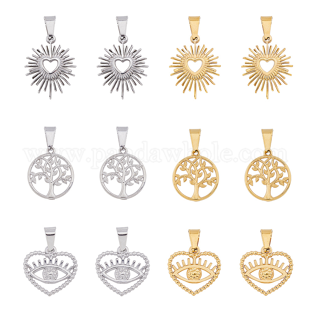 12 шт. 6 стиль вакуумное покрытие pvd 304 подвески из нержавеющей стали, полое сердце и плоская круглая с подвесками дерева жизни (02HMKN)