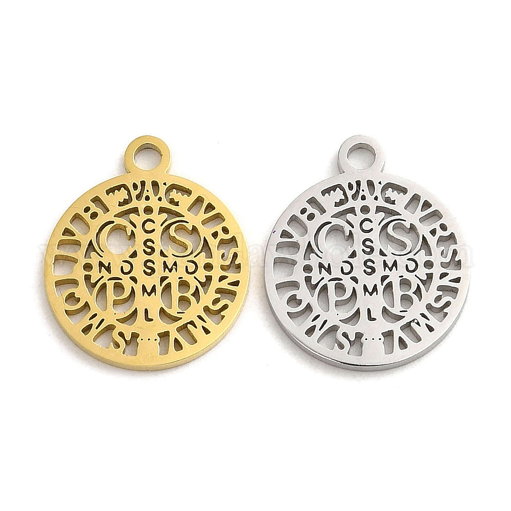 • Золотой Ионное покрытие (ip) 304 брелоки из нержавеющей стали, лазерная резка, святой Бенедикт медаль, со словом cssmlndsmd, золотые, 14.5x12x1 мм, отверстие : 1.5 мм