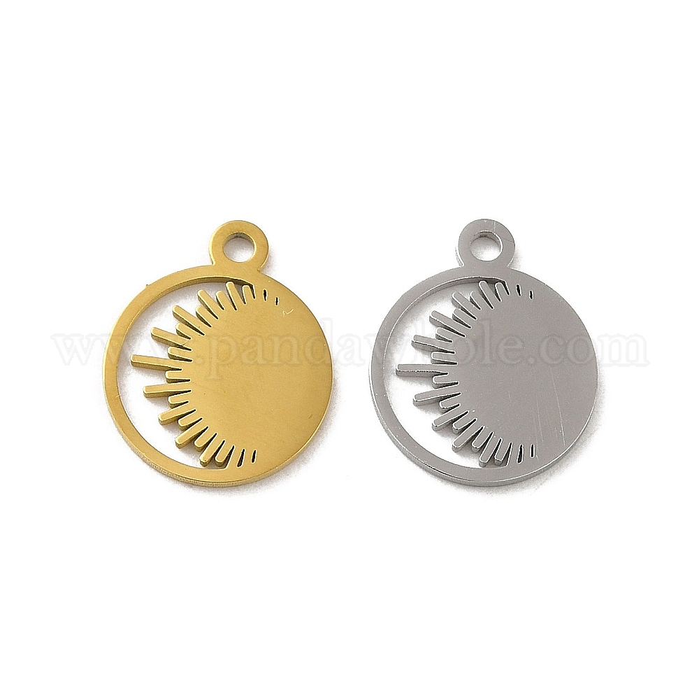 • Золотой Ионное покрытие (ip) 304 брелоки из нержавеющей стали, лазерная резка, плоский круглый с солнечным шармом, золотые, 14.5x12x1 мм, отверстие : 1.5 мм