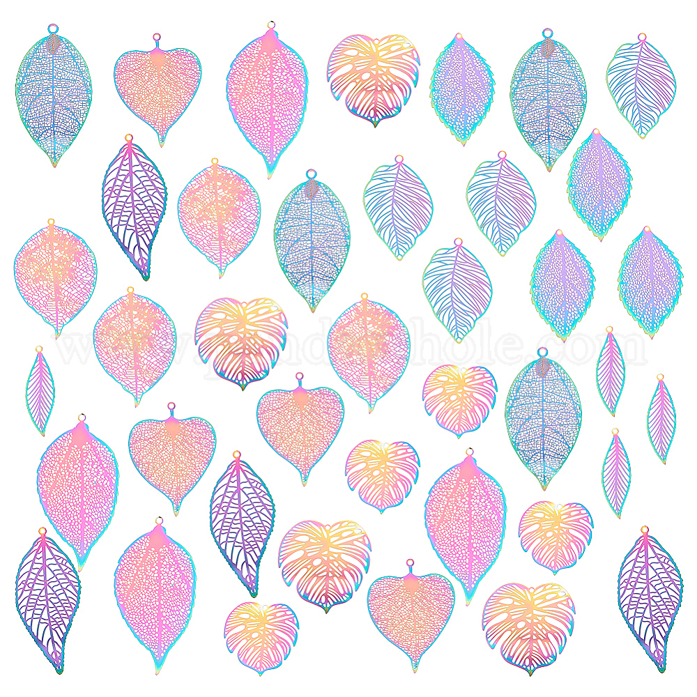 • Rainbow Color 40шт 10 стиль ионного покрытия (ip) 201 филигранные большие подвески из нержавеющей стали, гравированные металлические украшения, лист, Радуга цветов, 26~55x10~32x0.2~0.3 мм, отверстие : 1.2~1.8 мм, 4 шт / стиль