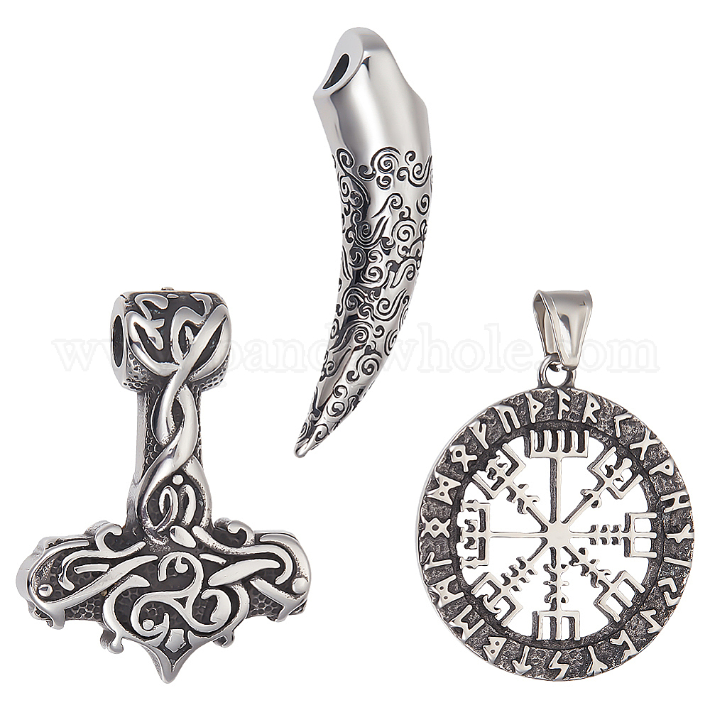 3 шт 3 стиль 304 подвески из нержавеющей стали, клык, молот Тора и плоский круглый с вегвизиром