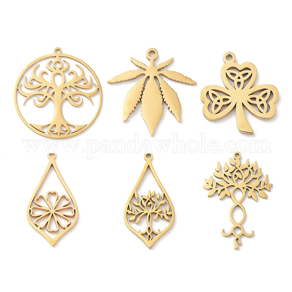 304 подвески из нержавеющей стали, лазерная резка, золотые, лист/дерево жизни/клевер/плоский круглый брелок