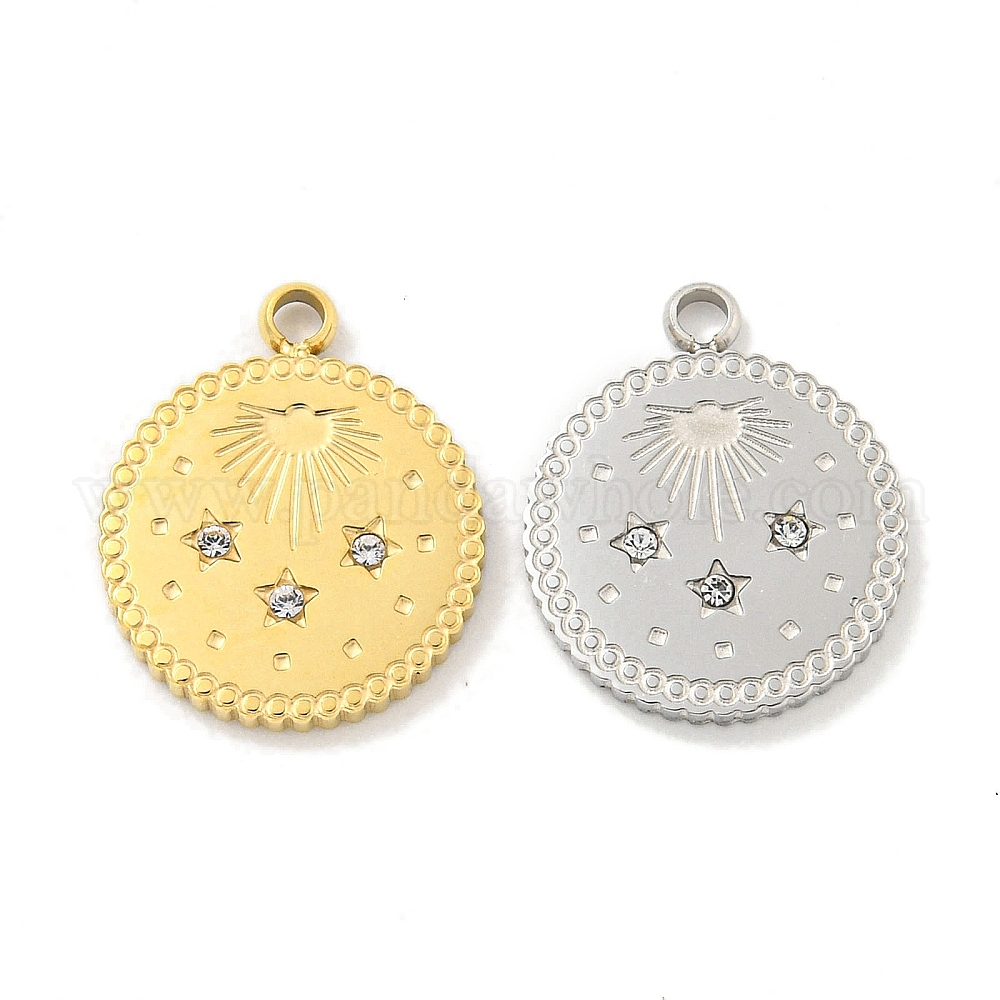• Настоящее золото 18K Вакуумное покрытие pvd 304 подвески из нержавеющей стали, с кристально горный хрусталь, плоский круглый с подвесками в виде звезды/солнца, реальный 18 k позолоченный, 14x11.5x1.5 мм, отверстие : 1.2 мм
