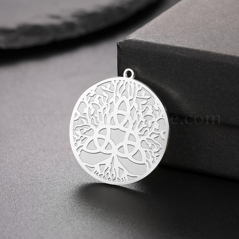 • Нержавеющая Сталь Цвет Подвески из нержавеющей стали, не тускнеющие, плоские круглые с дерева жизни, цвет нержавеющей стали, 27x25 мм