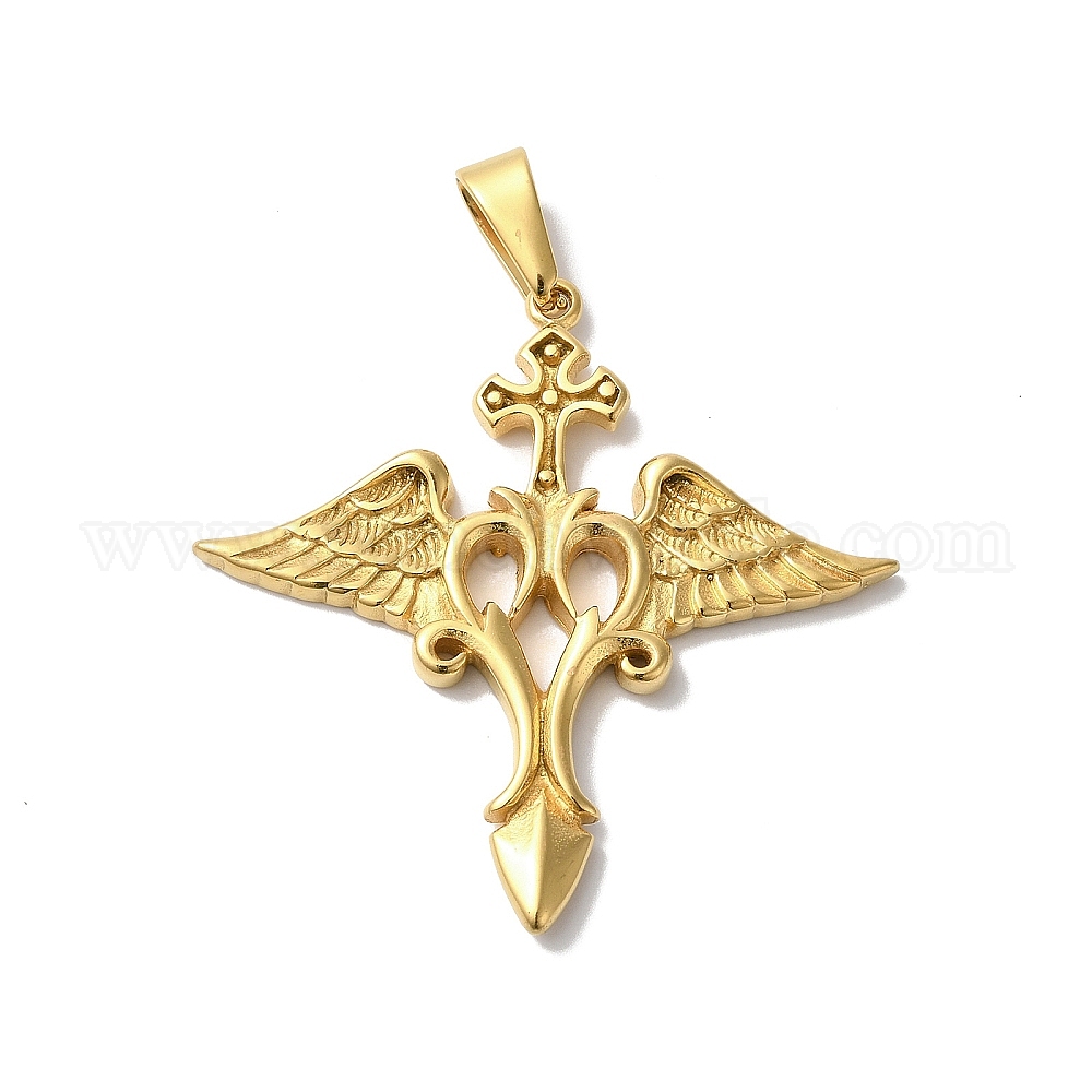 • Золотой Вакуумное покрытие pvd 304 подвески из нержавеющей стали, ангел с крестом-оберегом, золотые, 46.5x46.5x3 мм, отверстие : 10x4.5 мм