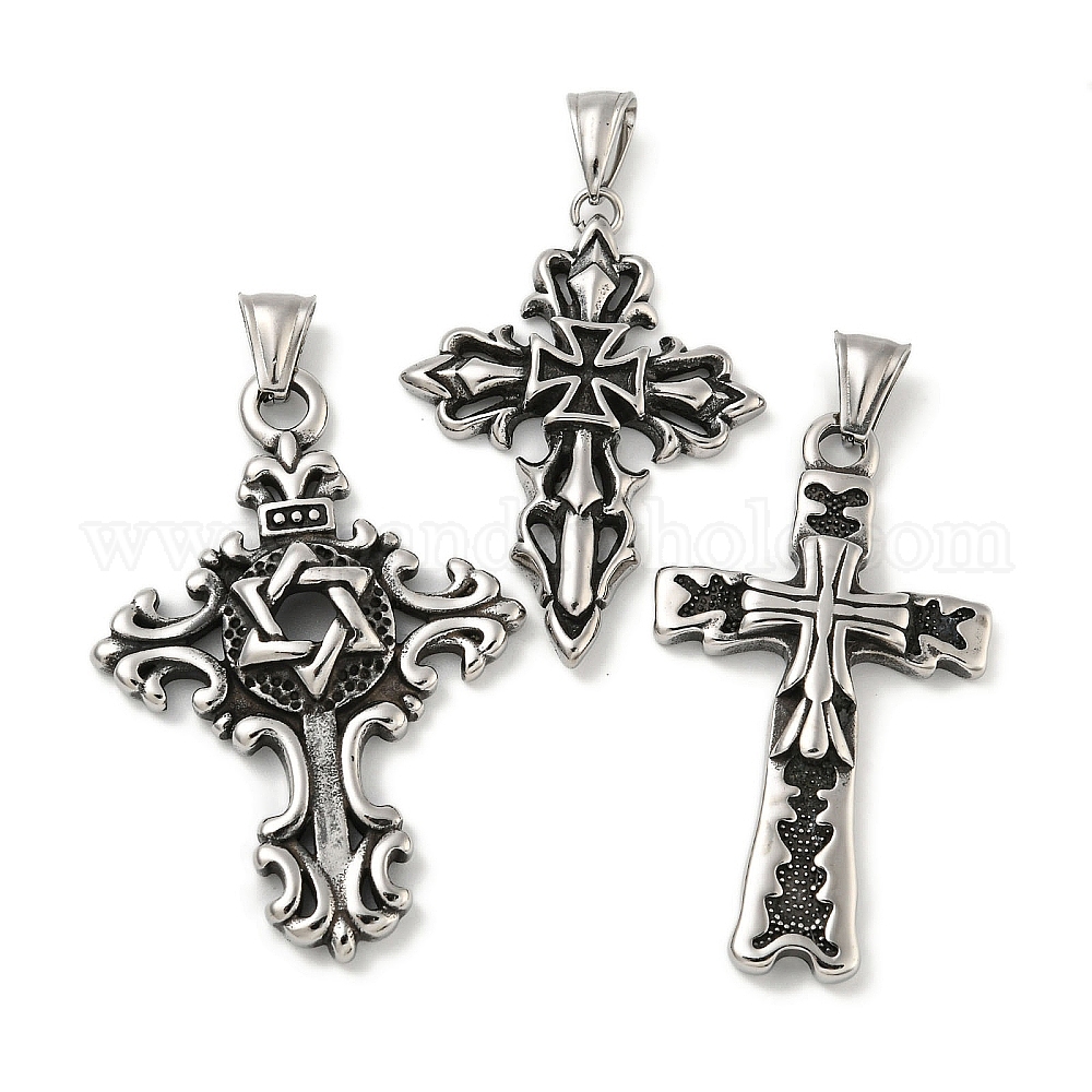 • Античное Серебро 316 хирургические подвески из нержавеющей стали, крестик, античное серебро, 43.5x33x5 мм, отверстие : 4.5x8.5 мм