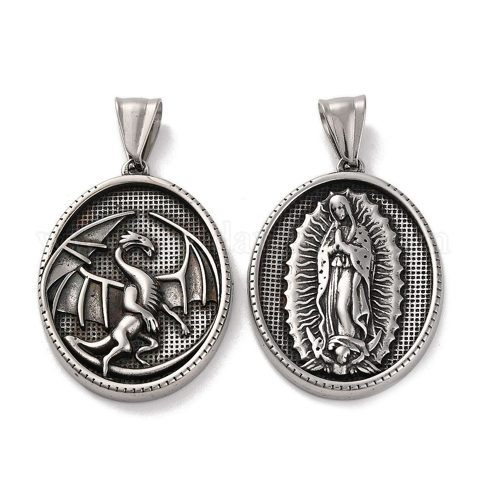 304 подвески из нержавеющей стали, античное серебро, овал с амулетом Девы Марии/дракона (02XBZA)