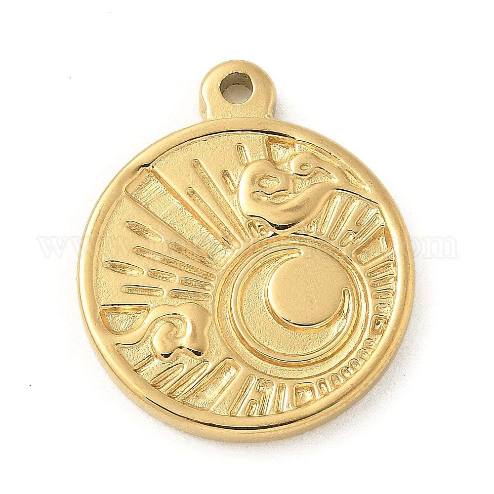 • Золотой 304 подвески из нержавеющей стали, плоский круглый с солнечным шармом, золотые, 21.5x18x2 мм, отверстие : 1.6 мм