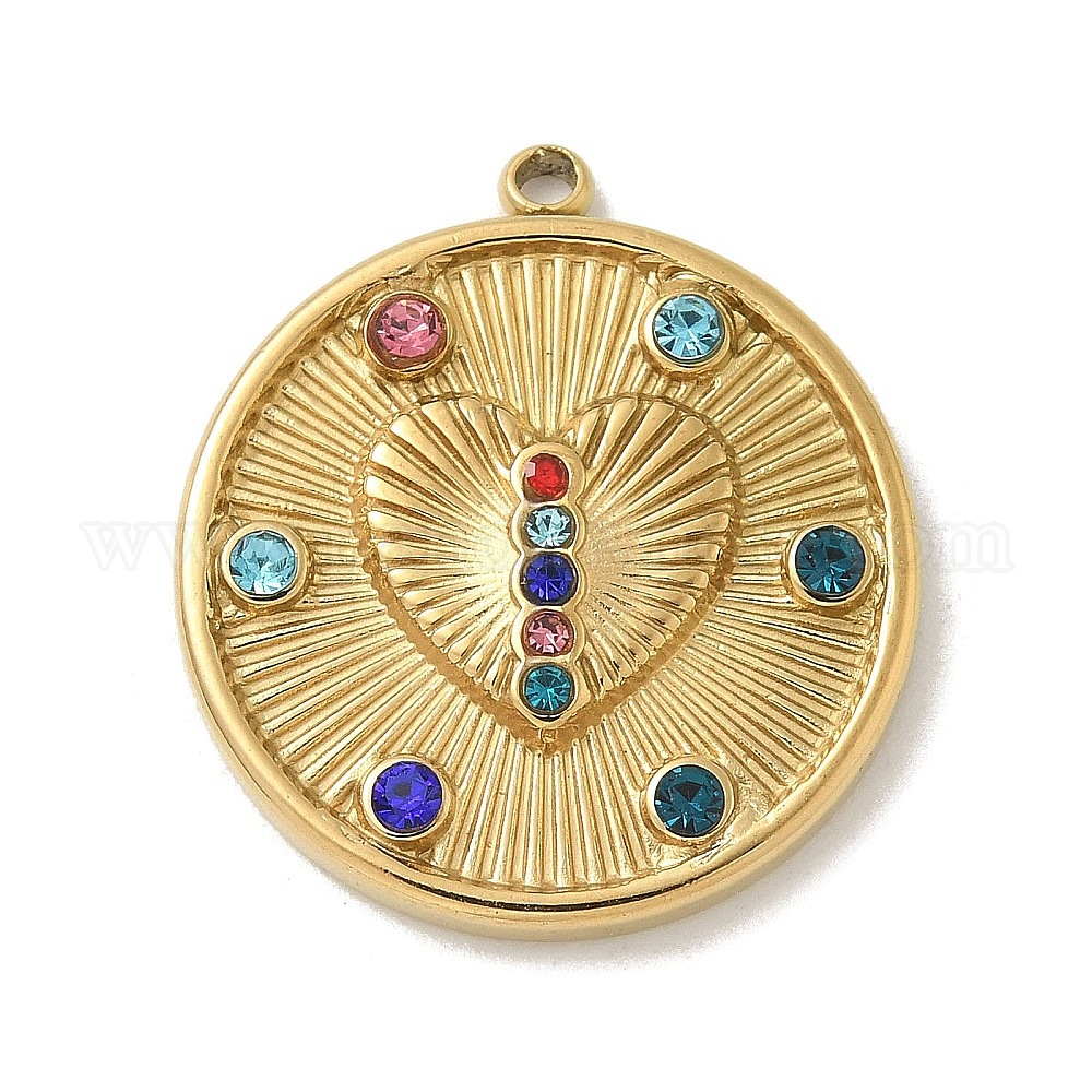 • Золотой 304 из нержавеющей стали горный хрусталь подвески, плоско-круглые, золотые, 21x18.5x3 мм, отверстие : 1.4 мм