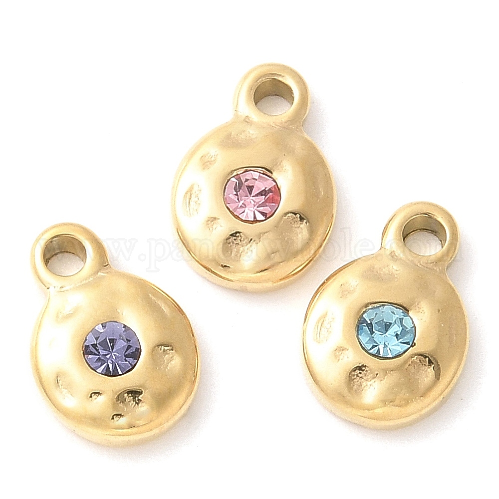 • Розовый 304 нержавеющая сталь с подвесками из стразов, ручная полировка, плоско-круглые, ионное покрытие (ip), золотые, светло-розовый, 9.5x6.5x2.5 мм, отверстие : 1.4 мм