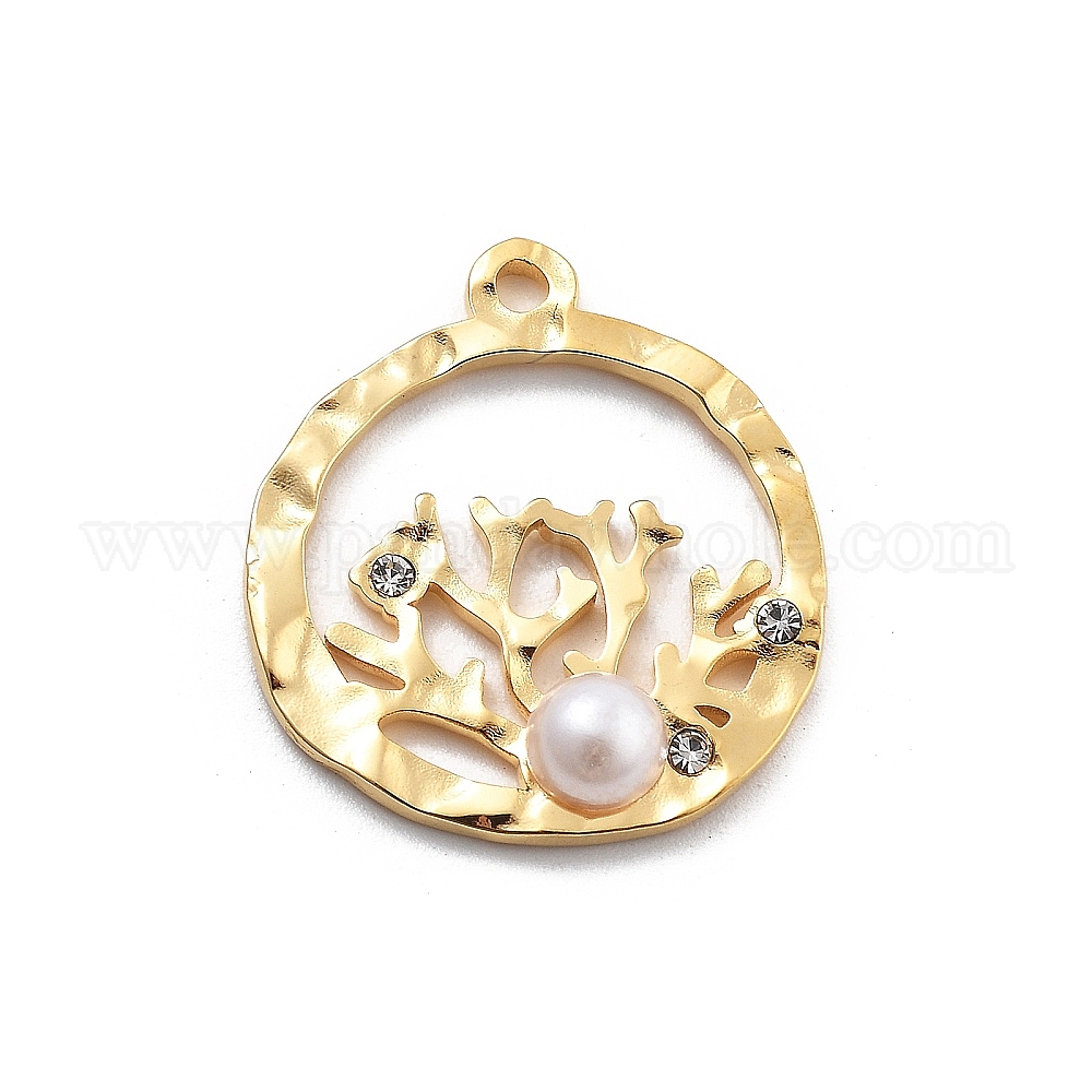 • Настоящее золото 18K 304 кулон из нержавеющей стали, с горный хрусталь и имитация жемчуга абс, вакуумное покрытие pvd, плоская круглая коралловая форма, реальный 18 k позолоченный, 22.5x20x4 мм, отверстие : 1.7 мм