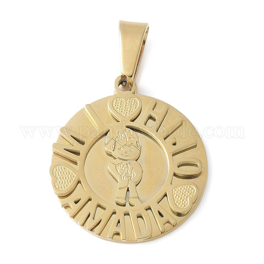 • Золотой 304 подвески из нержавеющей стали, ионное покрытие (ip), плоский круг с мальчиком и словом mi hijo amada, золотые, 22.5x20.5x2 мм, отверстие : 7x3.5 мм