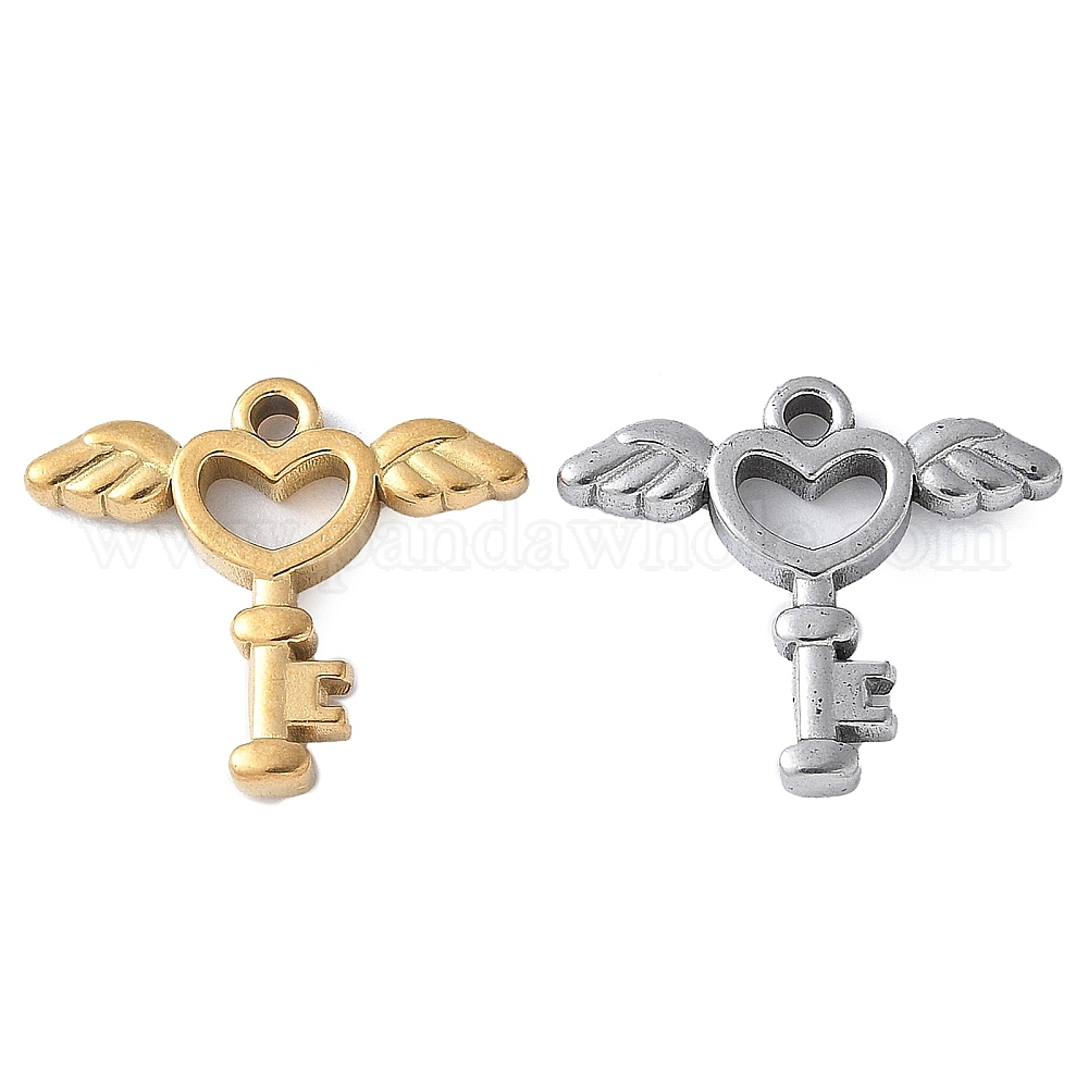 • Настоящее золото 18K 304 подвески из нержавеющей стали, ключ-сердечко с подвеской-крылом, вакуумное покрытие pvd, реальный 18 k позолоченный, 15.5x18x2.5 мм, отверстие : 1.5 мм