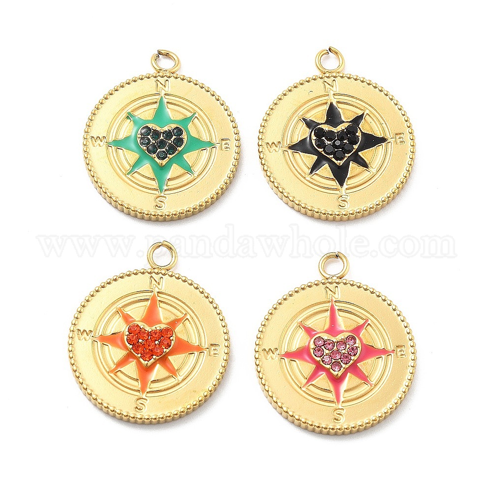 304 подвески из нержавеющей стали с эмалированными стразами, подвески в форме компаса, ионное покрытие (ip), реальный 14 k позолоченный