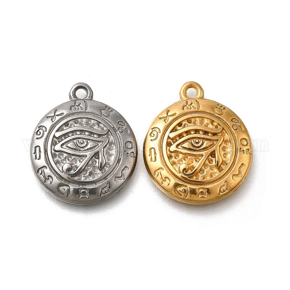 • Настоящее золото 18K 304 подвески из нержавеющей стали, плоский круглый шарм с египетским глазом Гора, ионное покрытие (ip), реальный 18 k позолоченный, 19x16.5x3.5 мм, отверстие : 1.5 мм