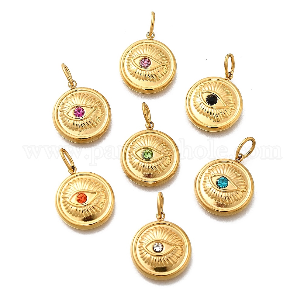 304 подвески из нержавеющей стали, со стразами и прыжковыми кольцами, ионное покрытие (ip), плоский круглый с шармом в виде глаз, реальный 14 k позолоченный